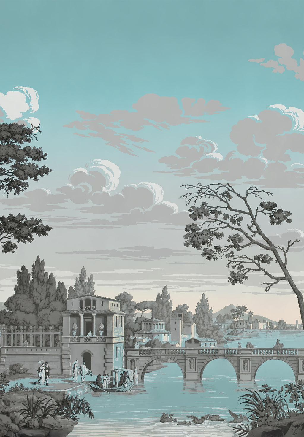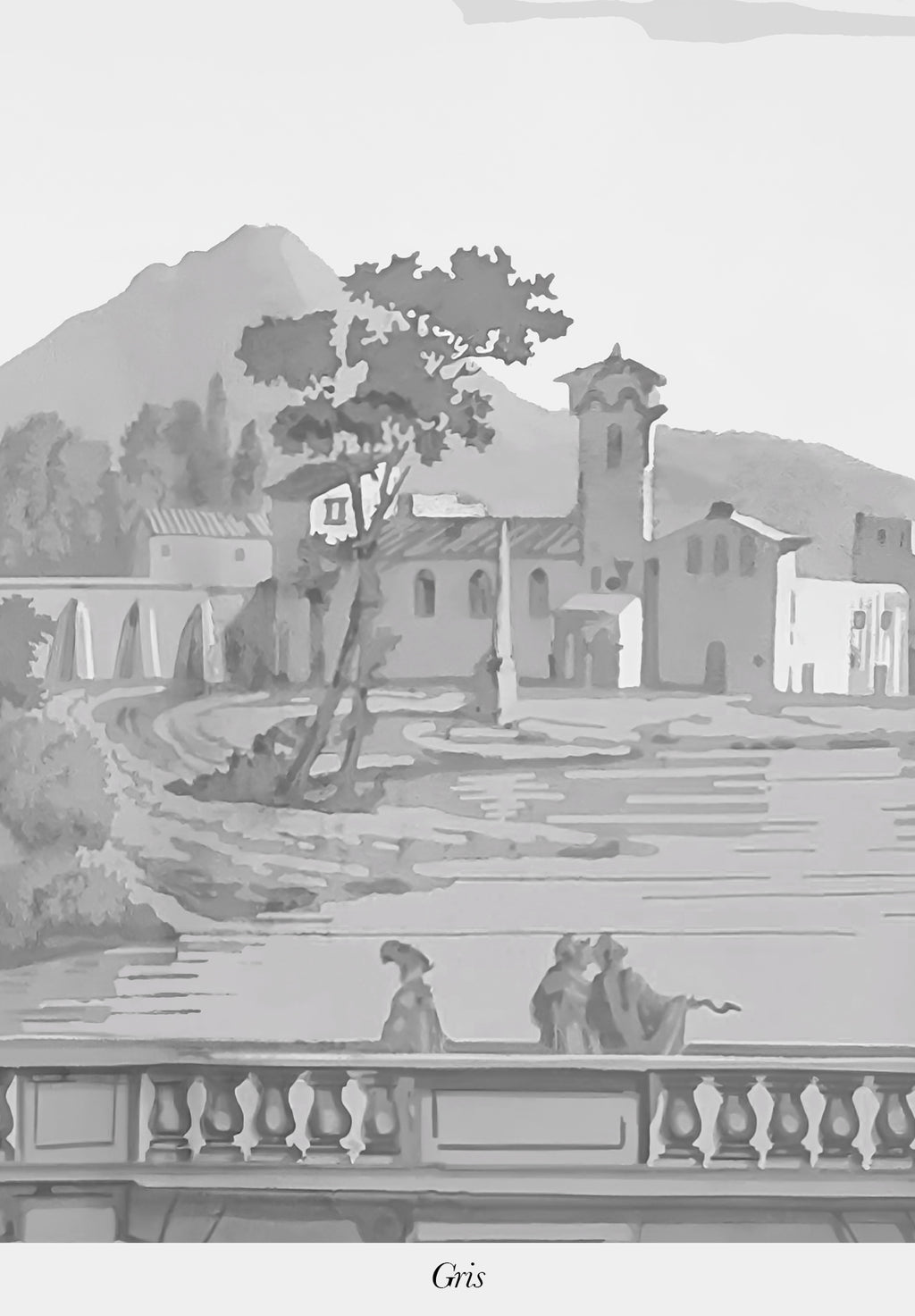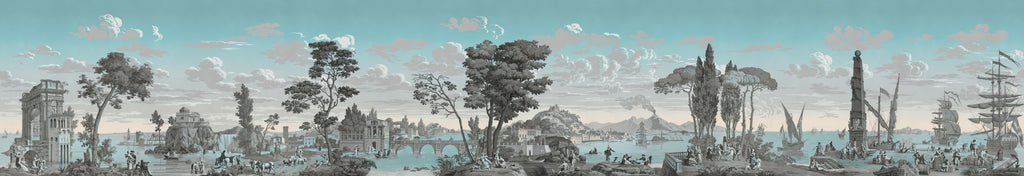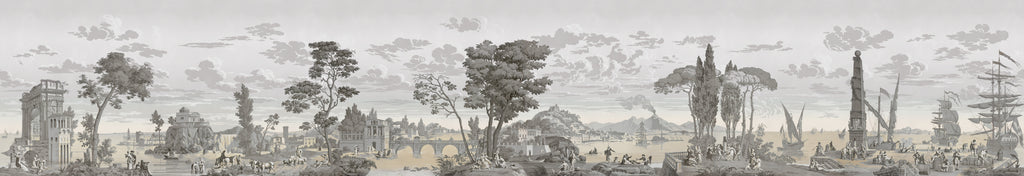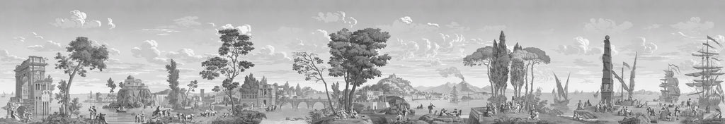 Dieses historische Dekor, das 1823 von der Manufaktur Joseph Dufour entworfen wurde, lädt zu einer Reise durch ein idealisiertes Italien ein, das damals im Zentrum der europäischen Vorstellungswelt stand. Ein Spaziergang durch mediterrane Landschaften, antike Ruinen und historische Städte, ursprünglich in einem aufwendigen handwerklichen Verfahren von der Platte gedruckt, zeugt dieses Panorama vom außergewöhnlichen Know-how der französischen Manufakturen, das wir heute mit Stolz durch seine Restaurierung wieder zum Leben erwecken.