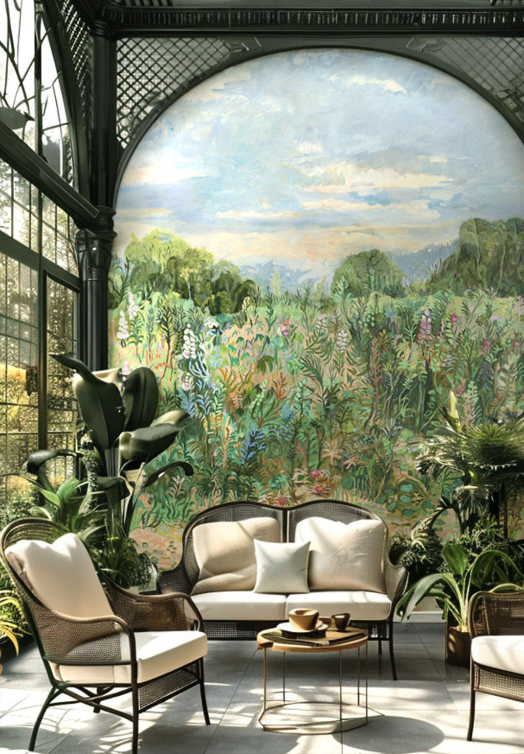 This painting by artist Véronique Masurel evokes a garden, giving the impression of an abundance of vegetation: trees, flowers, stems, grasses...