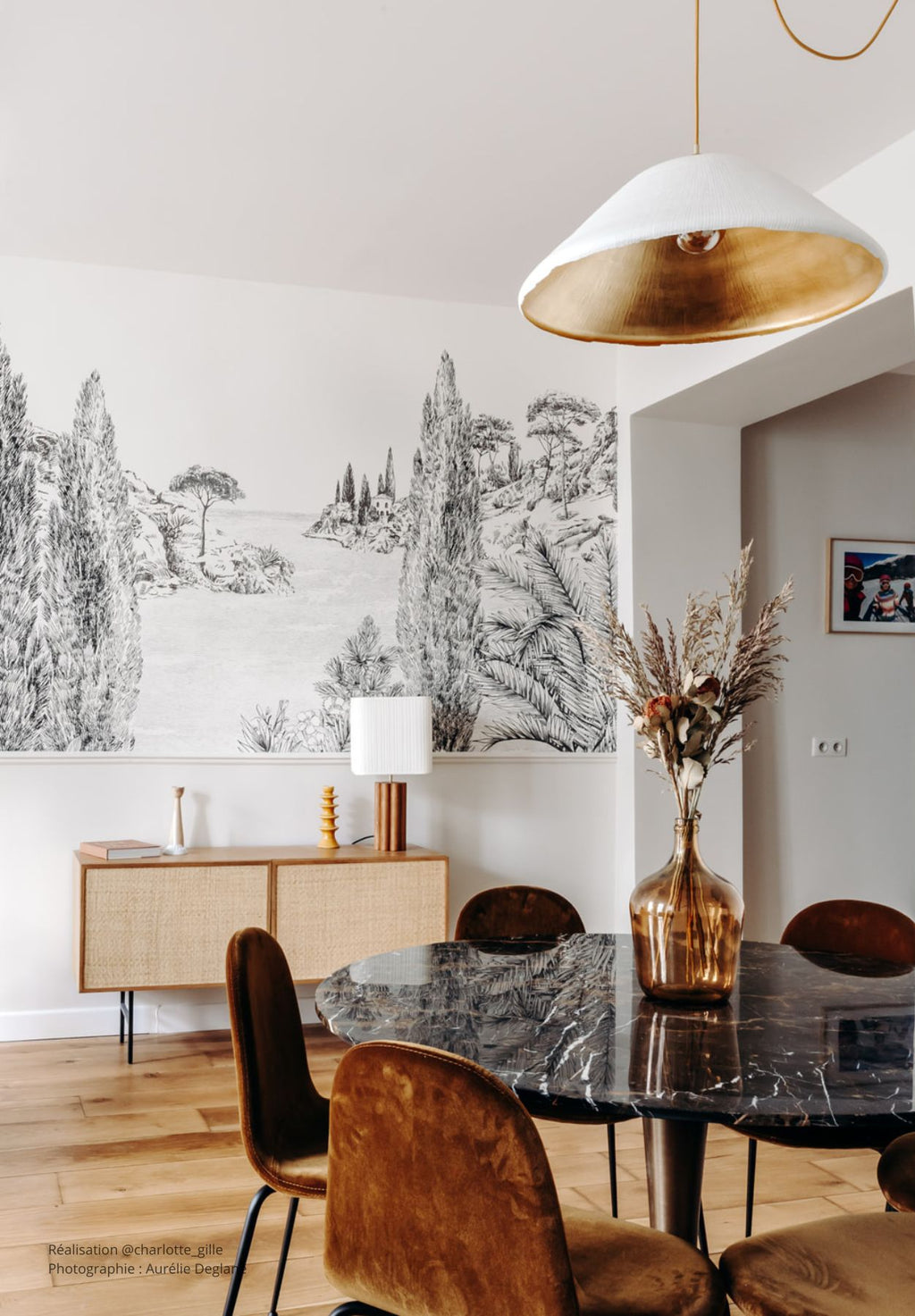 Este mural en grisalla fue creado en colaboración con Martine Dubreucq e Isabelle Parmentier. Evoca el litoral y la vegetación del norte de Méditerranée. Déjese llevar por el paisaje de una cala resguardada y bordeada por una colina flanqueada por un antiguo castillo.
