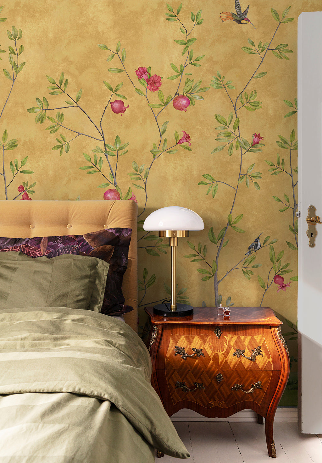 Grenades est la création de Catherine Cavarec Prigent, artiste renommée pour la grande finesse de son trait. Son œuvre d’origine est un immense dessin où se mélangent subtilement crayon de couleur et peinture à dorer. Inspiré d’une fresque antique de la Villa de Livia Drusilla près de Rome, Grenades emprunte aussi certaines influences à l’art asiatique, avec sa composition en chinoiserie traditionnelle. À mi-chemin entre l’orient et l’occident, Grenades offre une promenade dans un décor fait de raffinement et de gourmandise.